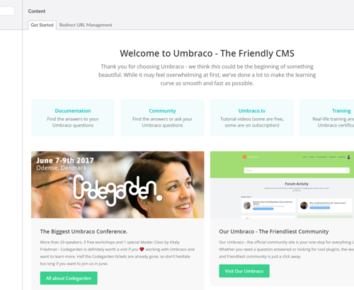 Umbraco har længe været kendt for den orange farve, men efter deres interne redesign og opdatering af den visuelle identitet på umbraco.com, er Umbraco 7.6 og Umbraco Cloud blevet mere konsistent med Umbraco’s branding. De sekundære knapper har fået en mere markant farve i form af den lilla farve, som komplementær farve til den grønne farve på de primære knapper.